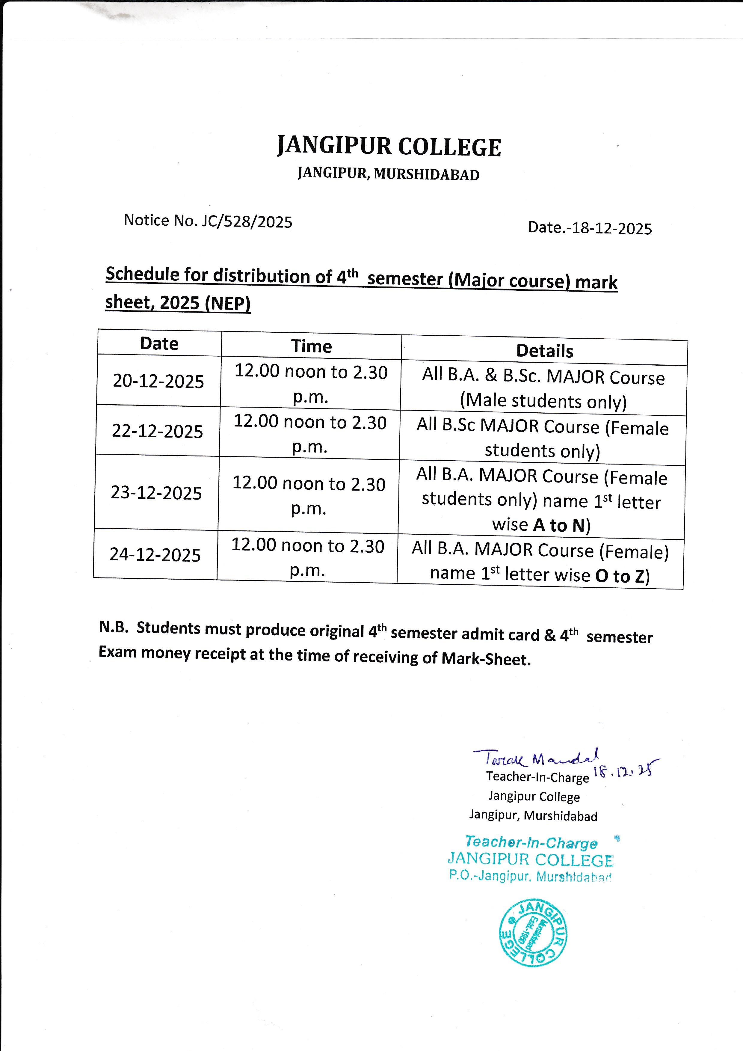 Notice : Schedule for distribution of Mark-Sheet of 4th Semester (CBCS) Exam, 2024 |